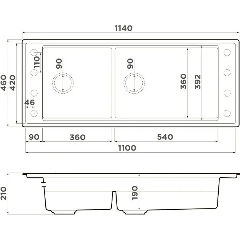 | Размер мойки (ШхДхГ) | 1100х460х210 мм |