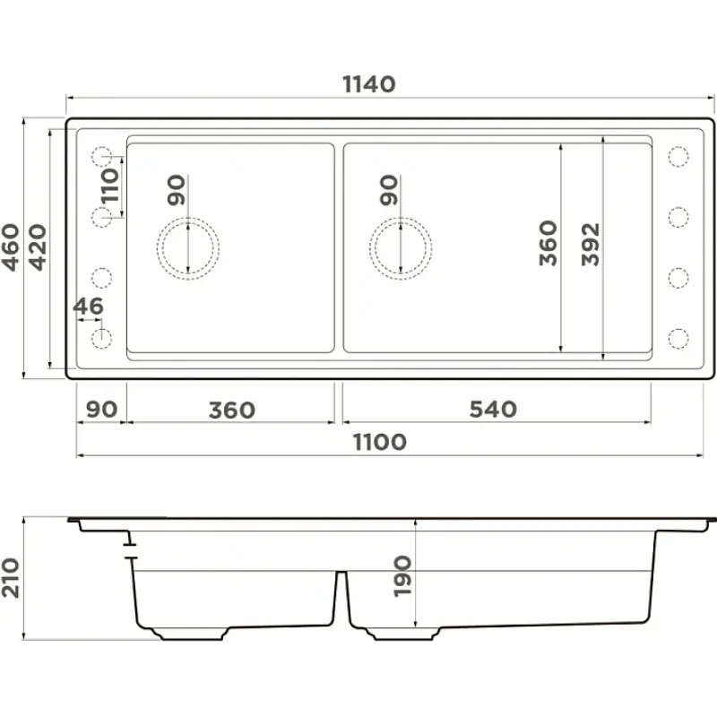 | Размер мойки (ШхДхГ) | 1100х460х210 мм |