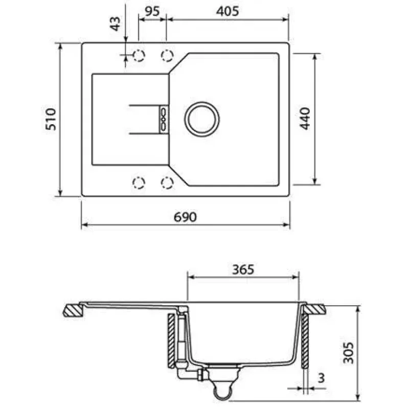 | Размер монтажного отверстия под мойку (ШхГ) | 67x49 см |