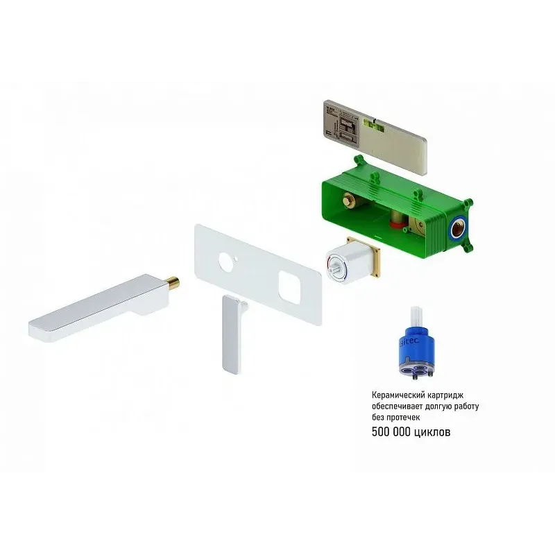| Комплектация | смеситель, монтажная коробка, излив, декоративная накладка смесителя, ручка смесителя, ключ шестигранный, инструкция |